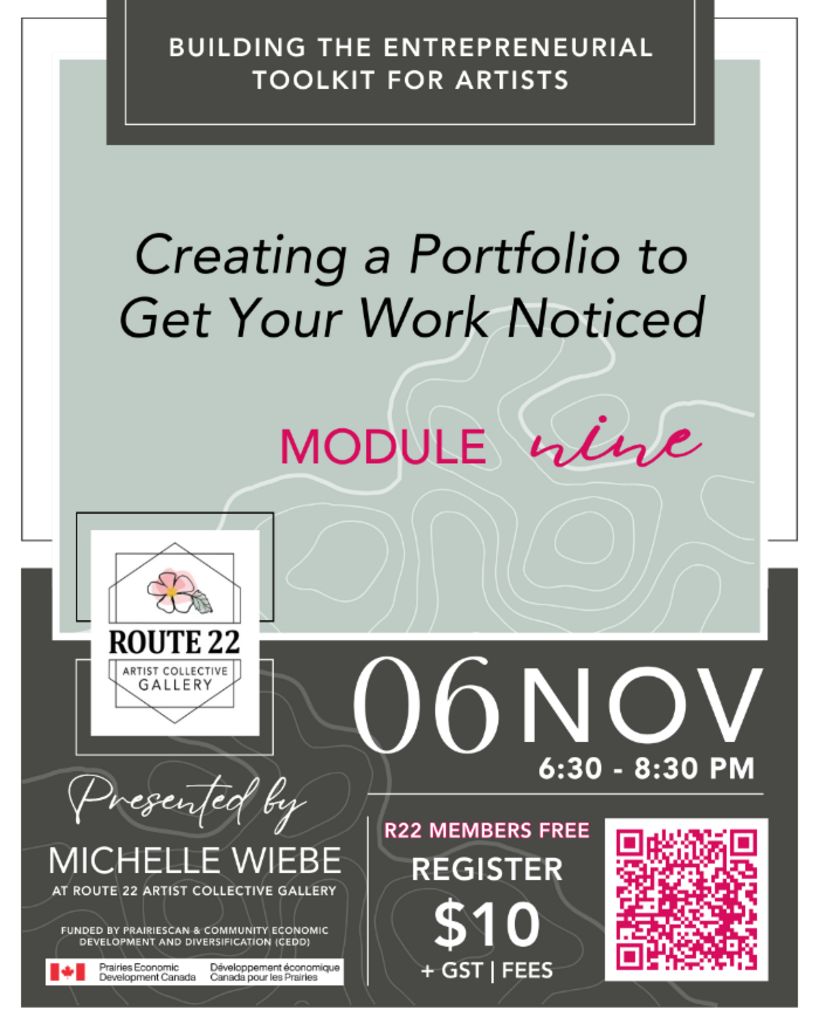 Showcasing artwork is one of the most important tasks an artist is responsible for. Portfolios are more than a collection of photographs; they are an introduction to your potential and show your skill to new audiences and funders. In this session, Michelle Wiebe will not only touch on the basics of documenting your work but also share what organizations are looking for in portfolio submissions that go beyond image quality.
