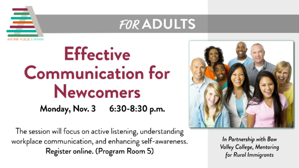 The session will focus on active listening, understanding workplace communication, and enhancing self-awareness. It will help newcomers learn strategies to improve the communication skills needed to succeed in the Canadian workplace.
