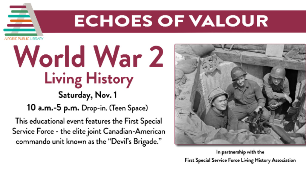 Step into the boots of history and experience the legacy of one of the most legendary Allied units of the Second World War. On November 1st, 2025, the Airdrie Public Library will proudly host Echoes of Valor: WWII Living History Experience, a powerful educational event honoring the bravery and sacrifice of the First Special Service Force—the elite joint Canadian-American commando unit known as the “Devil’s Brigade.”