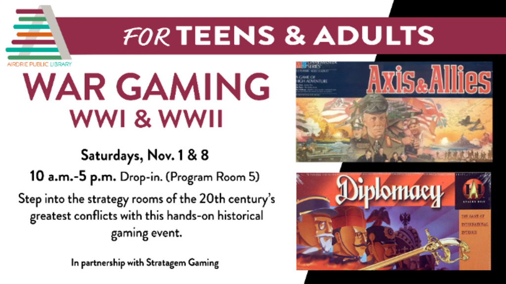 Step into the strategy rooms of the 20th century’s greatest conflicts with Wargaming WWI and WWII, a hands-on historical gaming event at Airdrie Public Library. Whether you're a seasoned strategist or new to tabletop war games, this program offers a chance to explore the political, military, and diplomatic dynamics of the World Wars through immersive gameplay.