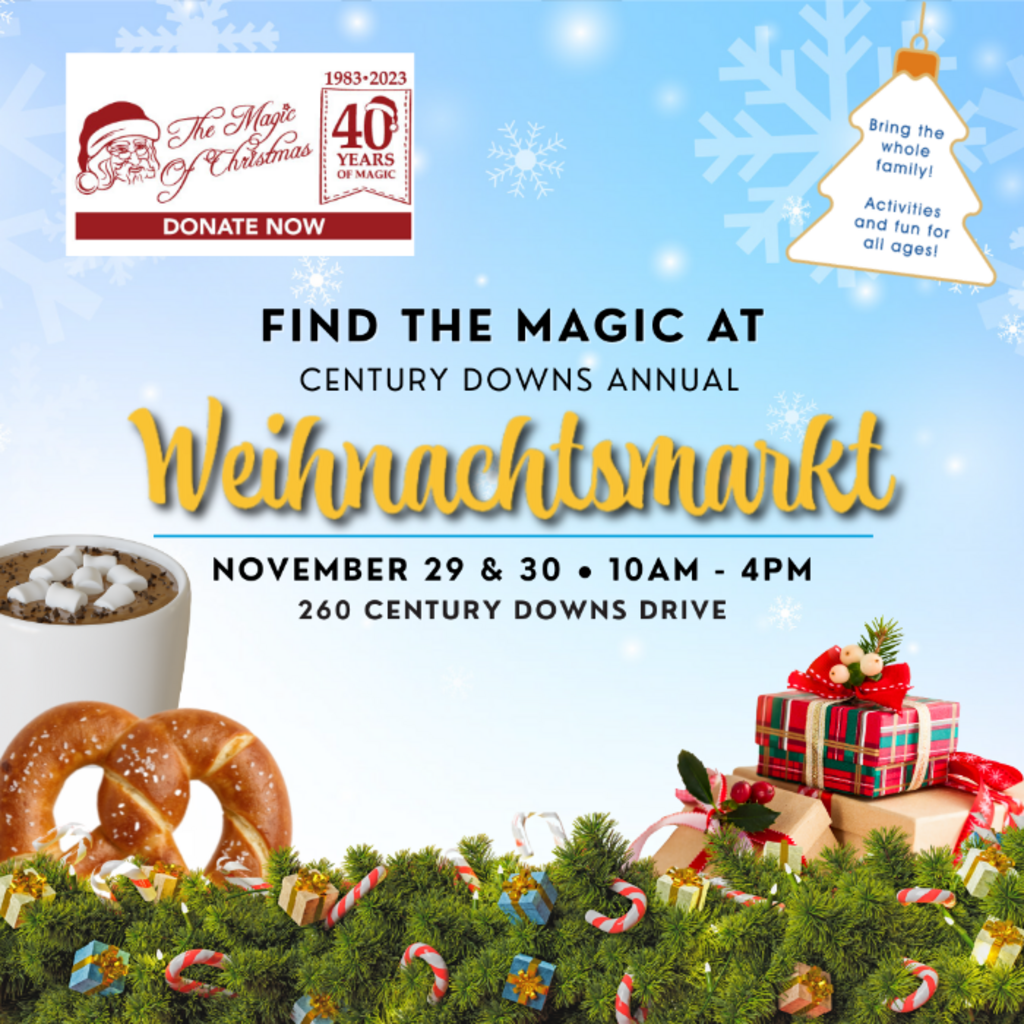 Get into the festive spirit at our Traditional Weihnachtsmarkt! Join us Saturday, November 29th, and Sunday, November 30th, 2025, from 10:00 AM to 4:00 PM in the barns at Century Downs.