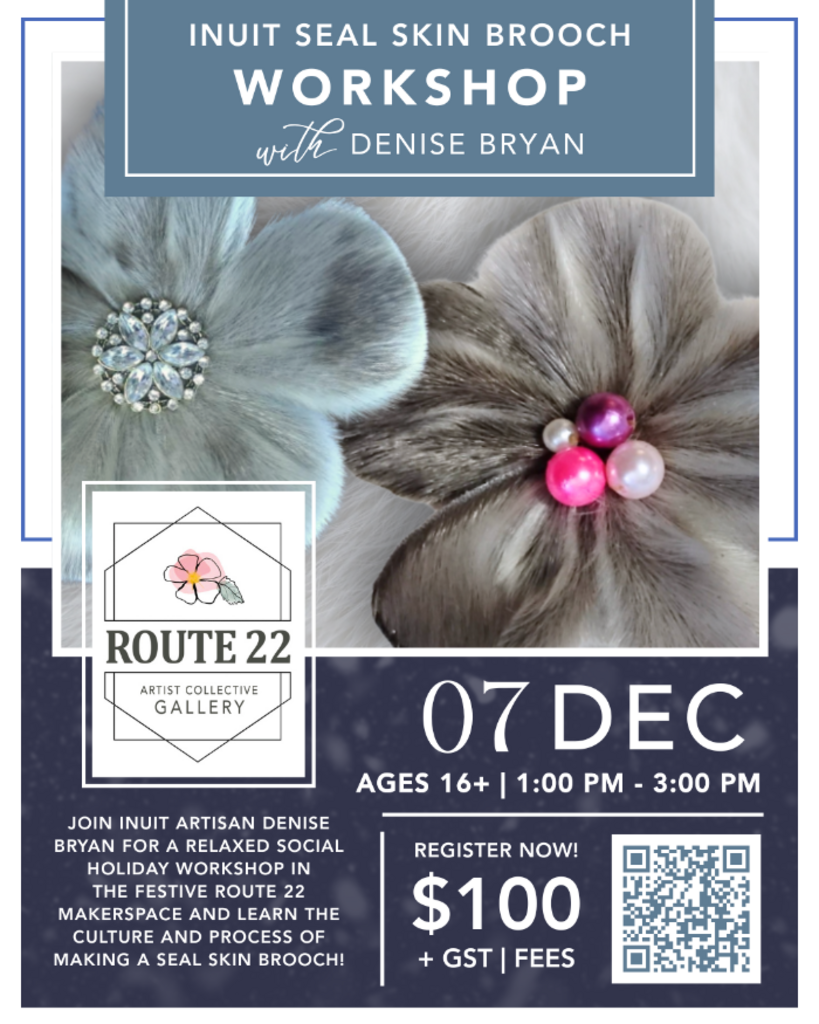 Enter into Route 22 Gallery's festive makerspace and join local Inuit artisan Denise Bryan for this relaxed social holiday workshop and learn more about Inuit culture while making a beautiful authentic seal fur brooch!