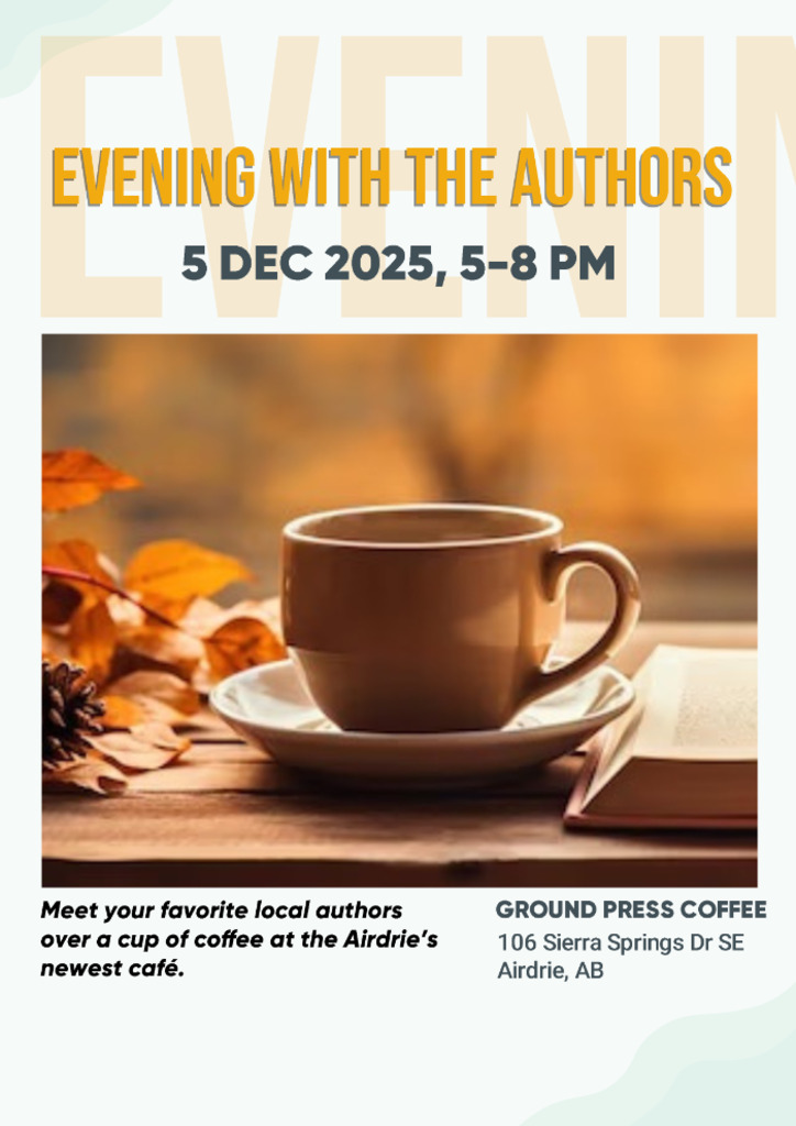 A come-and-go gathering bringing together Airdrie-area authors for an informal opportunity to connect, chat, and share their work in a relaxed community atmosphere.