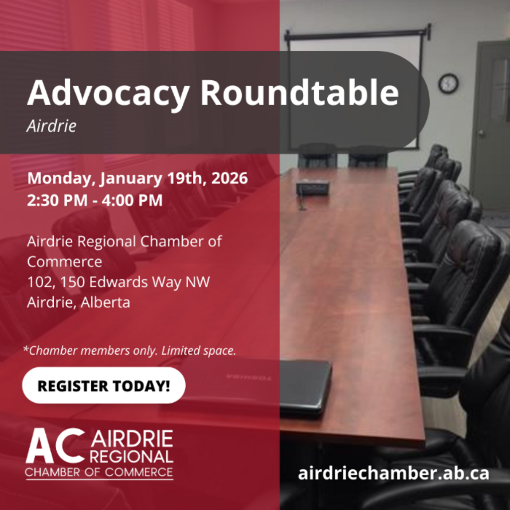 This session will bring Airdrie Regional Chamber of Commerce members together to identify key priorities, share perspectives, and shape collective solutions. It’s an opportunity to leverage the Chamber’s advocacy network to influence government decisions and strengthen the business environment in our region.