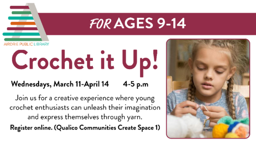 Whether you are a beginner or already have some crochet experience, ‘Crochet It Up’ welcomes all skill levels. Beyond the stitches, this program fosters a sense of community as kids can share ideas, showcase their creations, and make lasting friendships. Materials will be provided.
