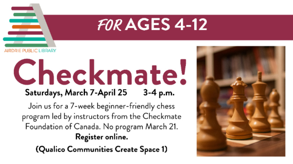 Join us for a 7-week beginner-friendly chess program led by instructors from the Checkmate Foundation of Canada. Participants will learn the fundamentals of chess while building strategy, focus, and problem-solving skills in a fun, supportive environment. Each session includes guided instruction and time to play, making it perfect for beginners while welcoming players of all experience levels.