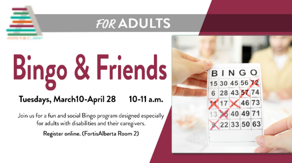 Join us for Bingo & Friends, a fun and social Bingo program designed especially for adults with disabilities and their support persons. Enjoy a welcoming, inclusive environment where participants can connect, play, and win small prizes! This program is a great way to build friendships and enjoy some light-hearted fun together.
