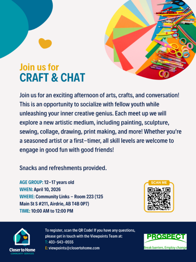 A Craft & Chat Workshop (in collaboration with Prospect) for youth ages 12-17 happening on Friday, April 10, 2026 from 10:00 AM to 12:00 PM.