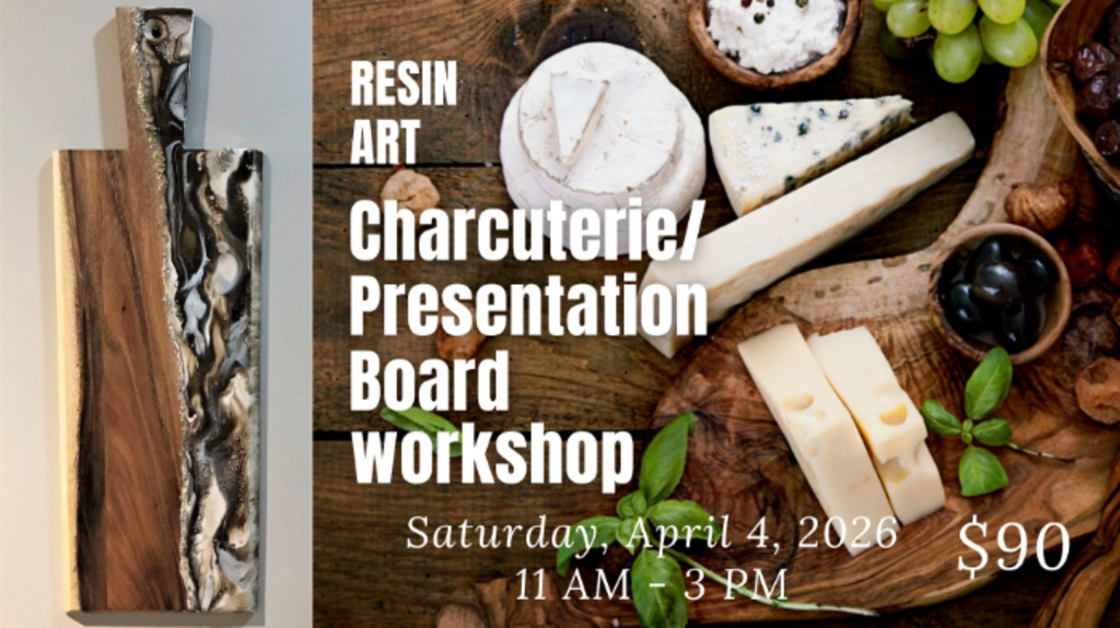 During this workshop we learn how to create a one-of-a-kind presentation board using FDA food safe resin and if you want to add a variety of amazing embellishments that are on hand in the Studio, you have that option as well. Others have adorned their boards with things like mirrored reflective glass, glass gems, metallic foils, german glass,sand, rocks or even pieces of jewelry to take your creation to the next level. If you have a special family heirloom or memento that means a lot to you that you think would be a beautiful addition to your board, please bring it along with you and we can explore that idea together.